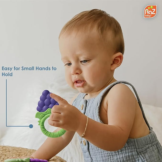 RaZbaby Fruitique Infant & Baby Massager & Teether Toy 3-Pack, Fruit-Shaped Multi-Texture Teethers Soothe Sore Gums, Non-Toxic BPA-Free Food-Grade Silicone, Hands-Free & Easy to Hold, 3M+