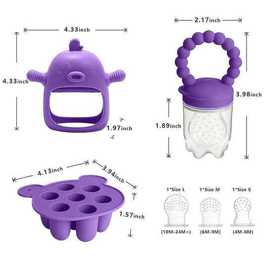Baby Fruit Food Feeder Breastmilk Popsicle Molds for Teething Relief - 3 Pack Feeding Sets - 1 Freezer Tray with Lid & 1 Teether Toy & 1 Silicone Pacifier + 3 Extra Sizes Infant Feed Mesh (Purple)