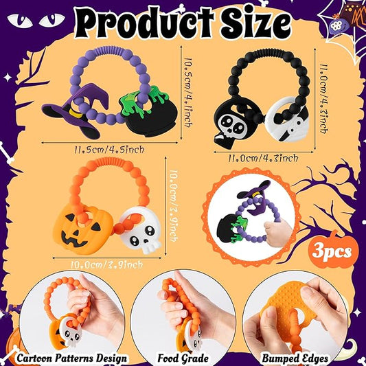 Silicone Teether Toys for Babies - 3Pcs Halloween Themed Teething Ring, Pumpkin Skull Baby Sensory Chew Toys with Rattles for Newborn Boy and Girl to Soothe Sore Gums, Baby Shower Birthday Gifts