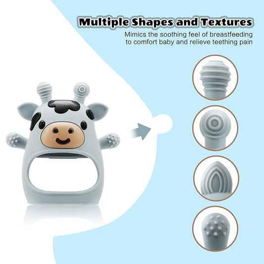TOHIBEE 2 Packs Baby Teething Toys for 0-6 6-12 Months, Food Grade Silicone Adjustable Cow Teething Mitten, Chew Teether Toys for Teething Pain Relief, Baby and New Born Essentials, Green & Beige