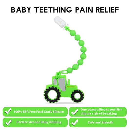 Baby Food Grade Silicone Tractor Truck Teether Toy with One Piece Design Pacifier Clip Holder,Teething Pain Relief Toys Gift Set for 3 Months+ Boys and Girls,Freezer Safe,BPA Free. (Green)
