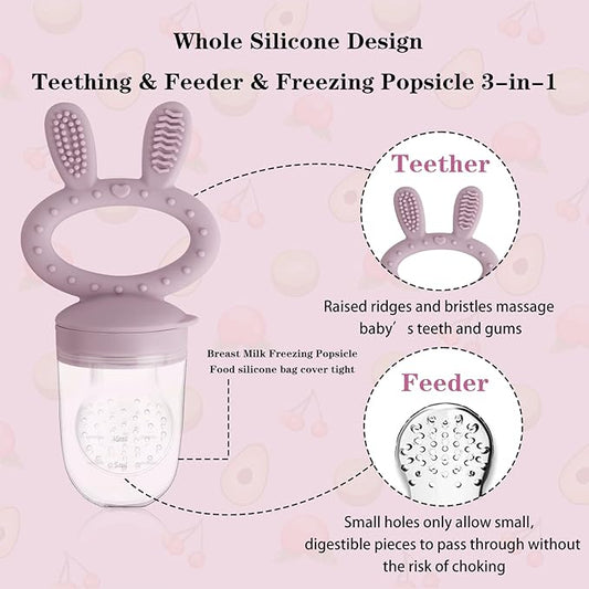 Baby Solids/Frozen Fruit Feeder Pacifier, Infant Teether Toy 4M+, BPA-Free Silicone Pouch & Nipple, Safely Introduce Solids, Teething Relief, 2-Pack (Rabbit - Pink Purple, S/M/L)
