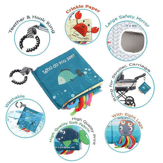 Fish Baby Books Toys, Touch Feel Cloth Crinkle Books for Babies,Baby Infant Toys 0-6, 6-12, 12-18 Months,Early Learning Education Toys,Shower Baby Gifts for Boys Girls,Teething,Mirror,Shark Ocean Book