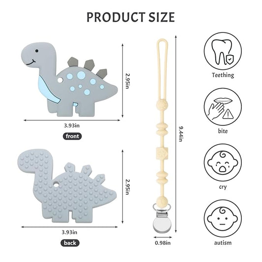 Baby Teething Toys for Babies, Dinosaur Teether Pain Relief Toy with One Piece Design Pacifier Clip Holder Set, Freezer Safe Neutral Shower Gift for Boys and Girls (Gray)