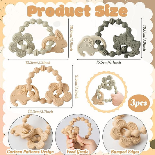 Silicone Teether Toys for Babies - 2ooya 3Pcs Animals Themed Teething Ring, Flower Leaves Baby Sensory Chew Toys with Rattles for Newborn Boy and Girl to Soothe Sore Gums, Baby Shower Birthday Gifts