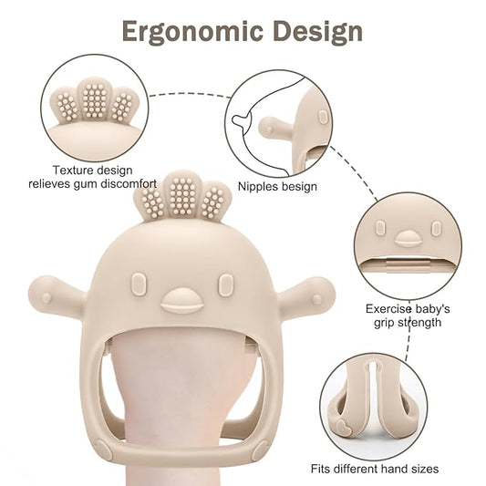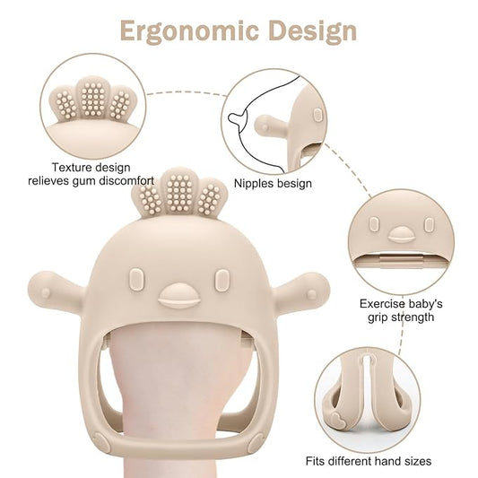4 Pack Silicone Teething Mitten for Babies with Baby Fruit Food Feeder & Freezer Tray Set, BPA Free Infant Teething Relief Toy for 3 Month+, Additional Silicone Sacs (Bear&Smile Beige)