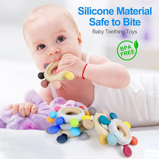 Socub Baby Teething Toys for 0-6 6-12 Months- BPA-Free Food-Grade Silicone & Natural Beech Wood Teether Ring for Newborn Infants Teething Relief- Easy-Grip Sensory Rattle Toys(Shifting Sand)