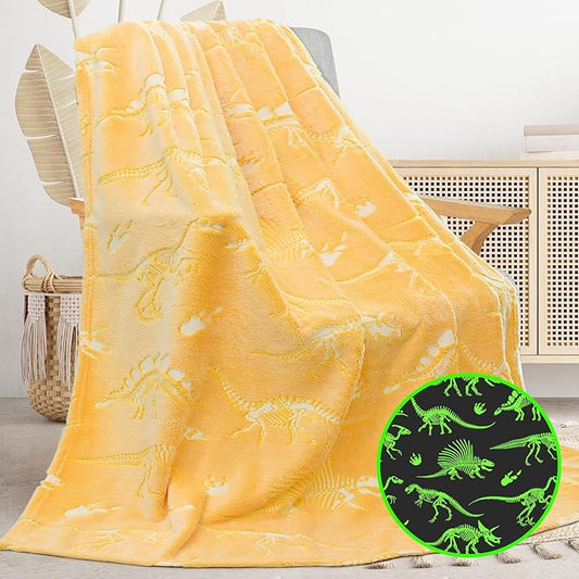 Glow in The Dark Dinosaur Blanket for Boys & Kids - Soft, Cute Dino Blanket, Gray Glowing, 90x108 inch