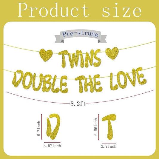 Twins Double The Love Gold Glitter Banner, NO-DIY,Twins Baby Shower/Twins Birthday Party Decorations