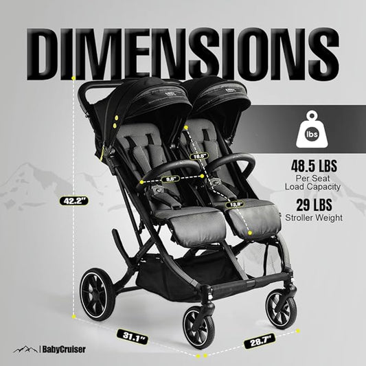 BabyCruiser Double Stroller Newborn and Toddler – Compact Side by Side Twin Stroller, Lightweight, Easy Maneuverability, Fits Standard Doors, Adjustable Settings from Birth up to 48.5 lbs per seat