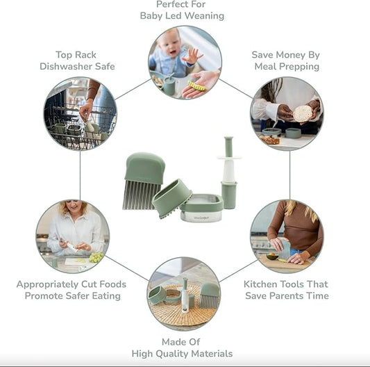 Baby Led Weaning Kitchen Tool Set, Includes Crinkle Cutter, Grape Cutter & Sandwich Cutter, Made In Collaboration With Feeding Specialist, Durable & Dishwasher Safe, Matte Green