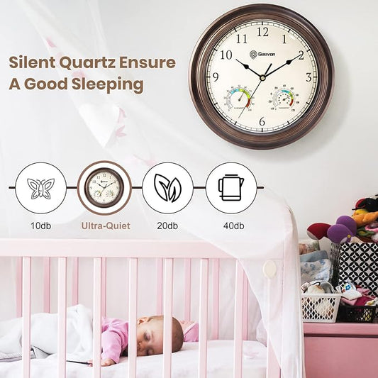 Geevon 12" Vintage Wall Clock Non Ticking with Hygrometer and Thermometer Combo,Battery Operated Quartz Decorative Wall Clocks for Home,Living Room,Office,Classroom,Kitchen,Bedroom Decor