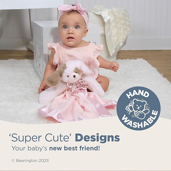 - Puppy Lovey Snuggle: Ultra-soft pink velour stuffed animal blanket with a plush puppy dog head and arms, plus a silky satin lining, makes the perfect security blanket for babies that’s machine washable