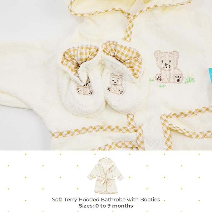 - MATCHING BABY BOOTIES | No bath set is complete without matching booties! Our booties are elasticized at the ankle and feature an applique that coordinates with the bathrobe.