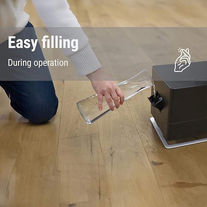 - FOR HEALTHY ROOM AIR: With its V4 filter technology, Oskar big is ideal for large rooms, where it quickly remedies excessively dry room air . As an economical evaporator, his integrated hygrostat allows precise humidification of the air. He prevents dust from being whirled up and improves health and well-being