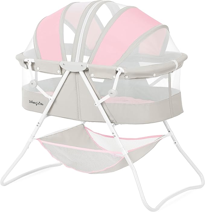 Dream On Me Karley Baby Bassinet in Grey and Pink, Lightweight Portable, Quick Fold and Easy to Carry , Adjustable Double Canopy, Indoor and Outdoor with Large Storage Basket.