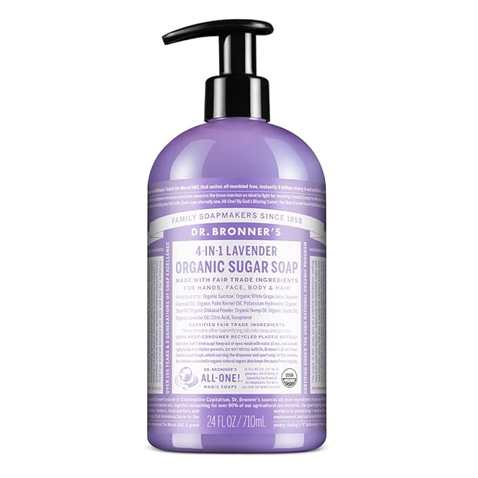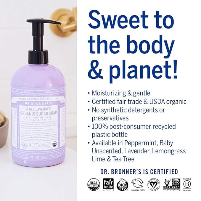 Dr. Bronner’s - Organic Sugar Soap (Lavender, 24 Ounce) - Made with Organic Oils, Sugar and Shikakai Powder, 4-in-1 Uses: Hands, Body, Face and Hair, Cleanses, Moisturizes and Nourishes, Vegan