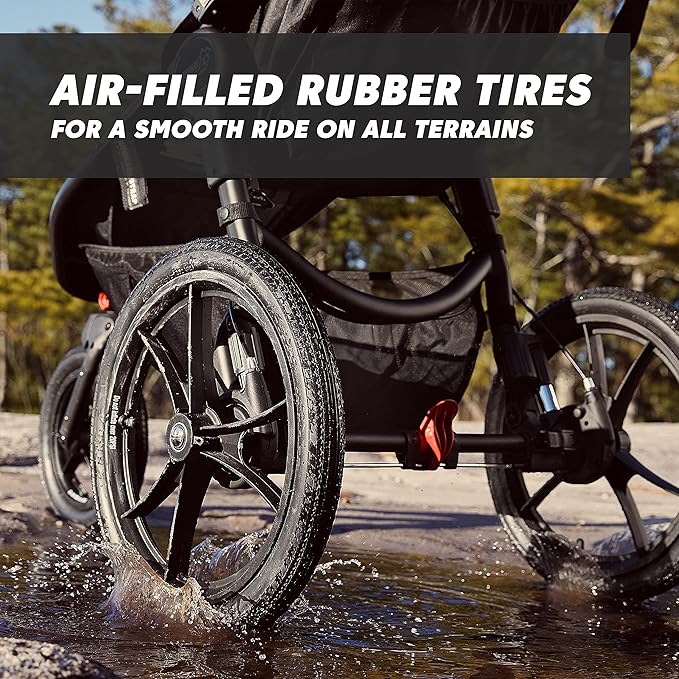 - Air-filled rubber tires and swivel lock on the handlebar make it easy to quickly switch between jogging and strolling modes