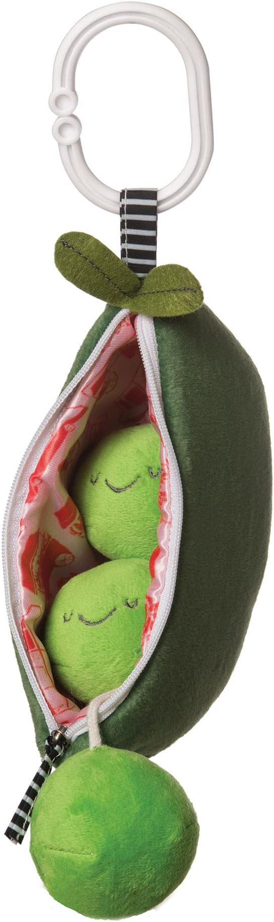 - AUDITORY CAUSE AND EFFECT: Farmer's Market Peas in a Pod features fabric peas with stimulating qualities: one crinkles, one rattles and one squeaks. The BPA-free C-clip hanging ring that doubles as a baby teether when it's not hanging. Remove travel ring for a stand-alone plush playmate for little hands to explore during tummy time. Baby travel toy with crinkle, rattle and squeaking sounds will foster cause and effect learning.