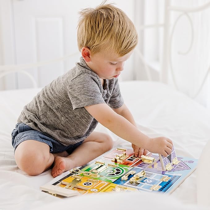 - Activity play board helps kids build dexterity as they figure out how 6 different latches work