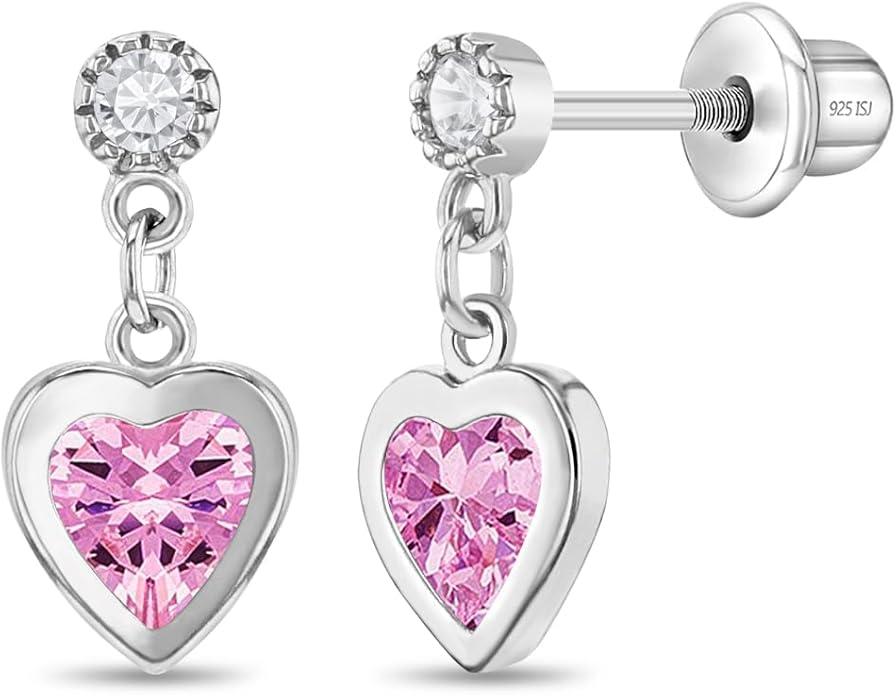 925 Sterling Silver Dangle Cubic Zirconia Heart Safety Screw Back Earrings For Young Girls -Heart Dangle Earrings With Security Backs For Young Children