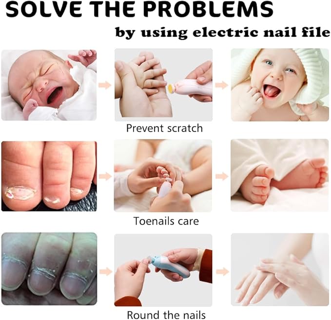 - LED LIGHT AND QUIET OPERATIONS - The baby nail file electric nail trimmer is built with soft LED front light which will help you use it in the dark. The nail filer for baby equips with a whisper-quiet motor. You can conveniently trim toes and fingernails without waking up the sleeping baby. Even if the baby is awake, you won't make any disturbance or afraid for him! Always enjoy a gentle manicure using the nail clippers that is CE , RoHS approved