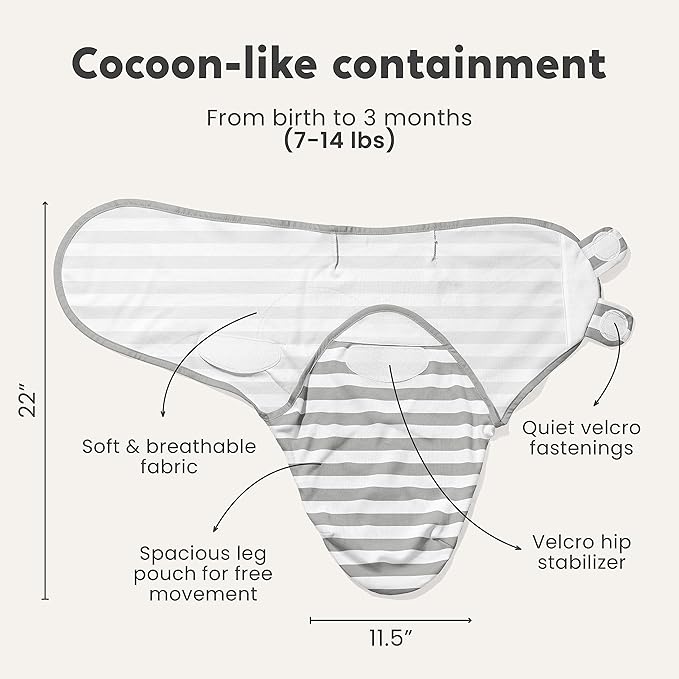 - Give your little one all of the comfort of swaddling with the security and ease of our quiet hook-and-hoop closure material