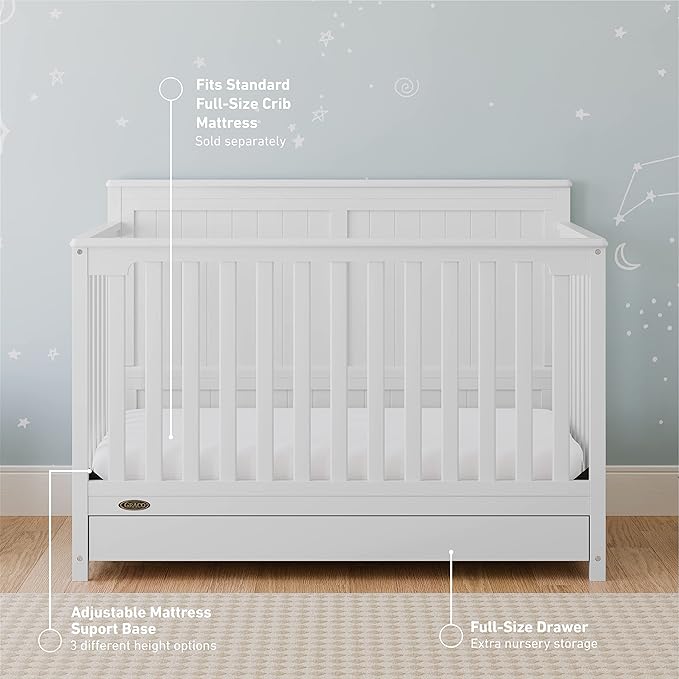 Graco Hadley 5-in-1 Convertible Crib with Drawer (White) – GREENGUARD Gold Certified, Crib with Drawer Combo, Full-Size Nursery Storage Drawer, Converts to Toddler Bed, Daybed