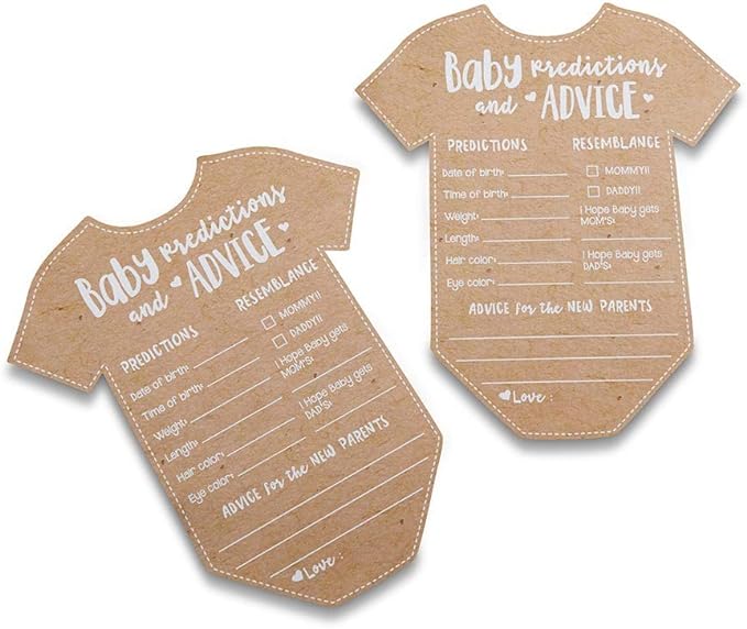 - Baby Prediction and Parent Advice Cards – These adorable baby prediction cards are crafted from high-quality faux kraft paper cardstock, shaped like a cute onesie to add a playful touch to any baby shower. Each card features white printed text with fun prompts for guests to predict key details like the baby’s arrival date, weight, and resemblance to mom or dad. The advice section also allows loved ones to share meaningful advice for new parents that will be cherished for years to come.