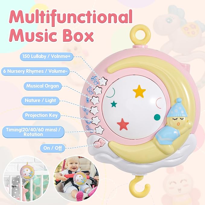 - [Musical and Projector Crib Mobile]--Baby crib mobile with music and lights has 2 mode of projection: Star lights and Image. Also have soft and glowing night light. Music box include 150 lullabies, 6 songs, 5 nature sounds and 10 musical organ. Can adjustable volume, bring comfortable environment for baby sleep.