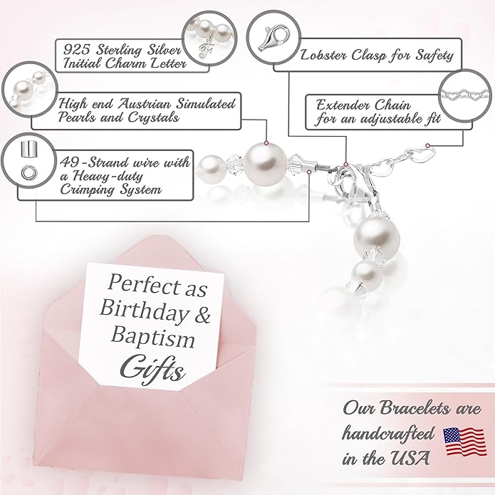- EXCEPTIONAL QUALITY: Handmade in the USA, custom bracelets for kids are made with high-end simulated European Pearls, initial jewelry for flower girls, friendship bracelets sweet 16, Baby Shower gifts