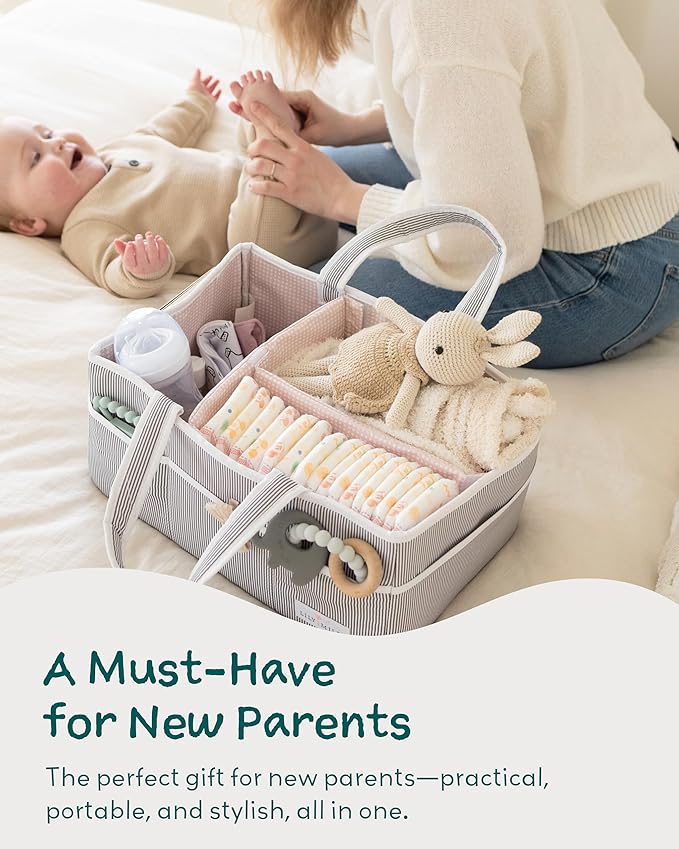 - Perfect Baby Shower Gifts Ideas & Favorites - Baby girl newborns registry must haves! This blush gray diaper caddy makes a great gift basket at baby shower or newborn gift registry. This practical and versatile organizer can be used by moms from crib side changing table to living room, or car backseat.