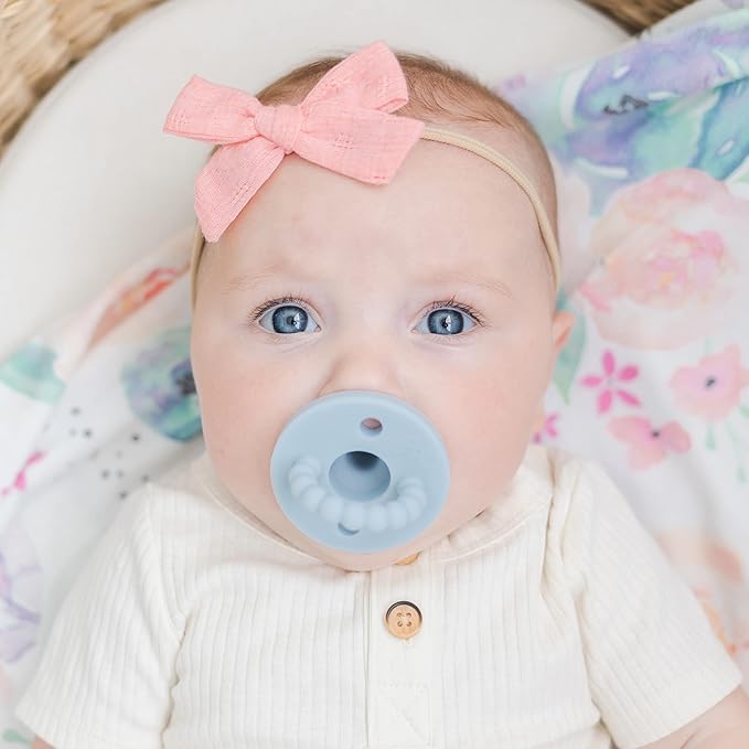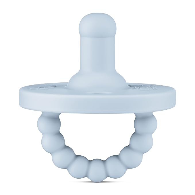 - SOOTHING AND COMFORTABLE – Soft nipple on baby paci gently mimics breastfeeding for natural palette development while soother feels good on baby's gums.