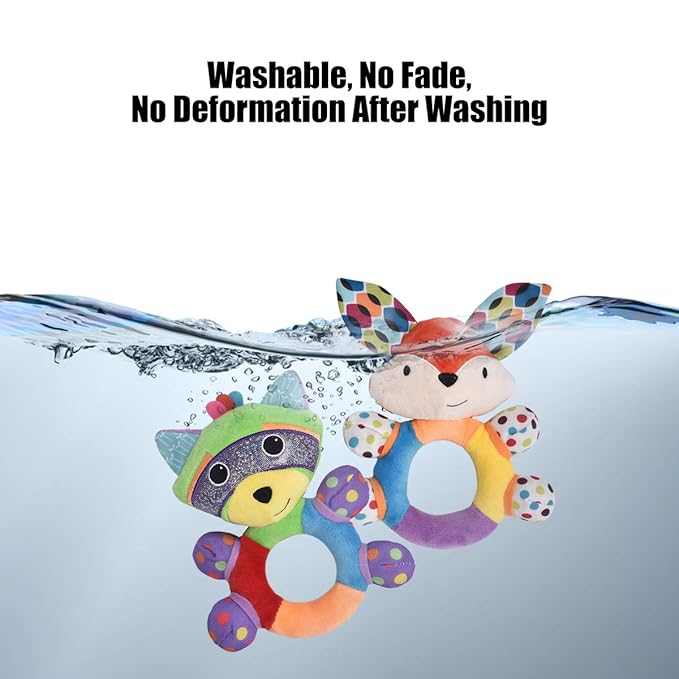 - SAFE BABY SENSORY TOYS: This cute stuffed baby car accessory toys include fox and raccoon which are high contrast, soft, multi-textured and well-made with high quality materials, comfortable and non-toxic, safe toys for newborn babies to snuggle with while stimulating baby’s sense of touch. Our rattle teether toys had been passed the test of of ASTM F963 & CPSIA & CPC by Third-Party Lab, conforms to Federal Toy Safety Standard, so just buying confident with HAHA Baby Toys.