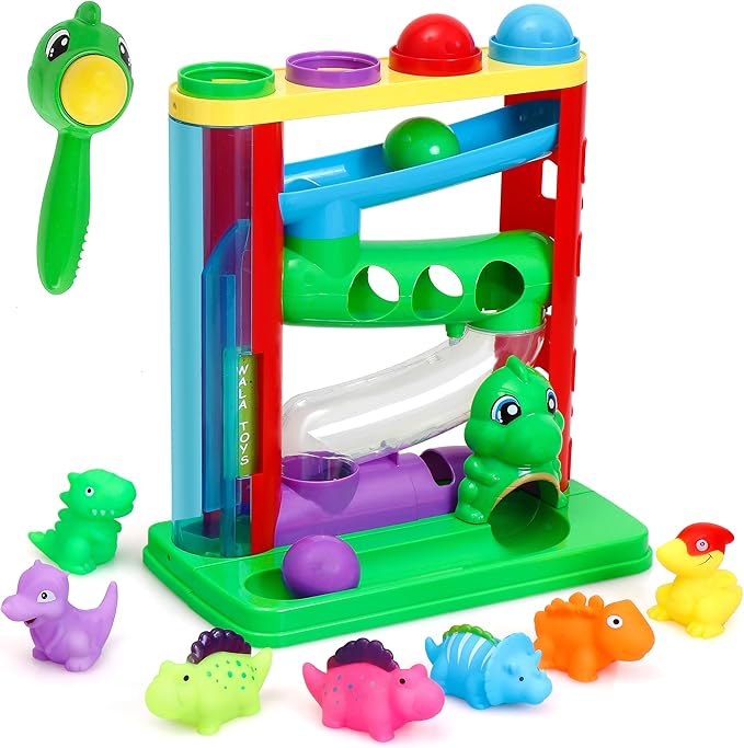 - POUND BALL AND HAMMER TOY : Your kids will love this multi-color pound a ball with Dinosaurs hammering toy. Toddlers need to pound the balls using toy hammer through the built-in holes and the balls will roll over. Toddlers can play again and again with this pounding toy.