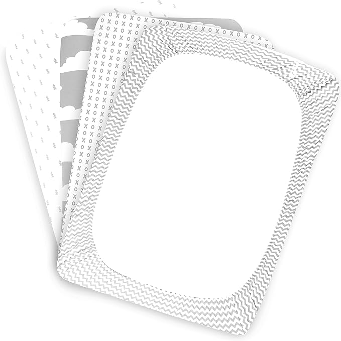BaeBae Goods Premium Crib Sheets for Baby Boys and Girls, 4 Pack, Soft and Breathable Jersey Knit Fitted Sheet Set, Grey and White, Cute Gender Neutral Nursery Mattress Bedding, Universal Fit