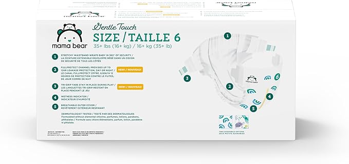 - IN THE BOX: Mama Bear Gentle Touch Diapers for babies 35+ pounds; size 6; (4 packs of 27 diapers each, 108 total)