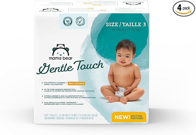 - IN THE BOX: Mama Bear Gentle Touch Diapers for babies 16-28 pounds; size 3; 168 count (4 packs of 42)