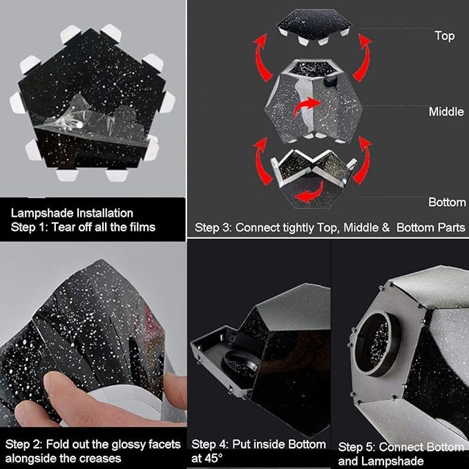 - STAR LIGHT PROJECTOR AND DIY LAMPSHADES : The multiple combinations of 3 colours (Yellow, White and Blue) provides you with a wide panoramic effect. The lampshades need to be assembled by yourself. The foldable lampshades can prevent the breakage. Rotating light pedestal allows you to project the light straight up or point in a different direction and have the convenience to cover the area as large as 130 ft2 (12M2) within the distance of 9 ft (2.8M).