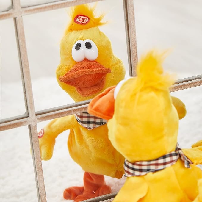 - WHAT'S THIS: It's obvious that this is a cute electric duck plush toy with a big comb and tail, and a pair of bright big eyes. It's very interesting, this duck stuffed animal can sing, shake, and swing its hands and feet. And he will imitate the crowing of duck, sing cheerful songs, and dance with his hands and feet to match the songs, providing hours of fun for kids and babies. Imagine how interesting it is, which child or parent could refuse such a fun and lovely rooster!