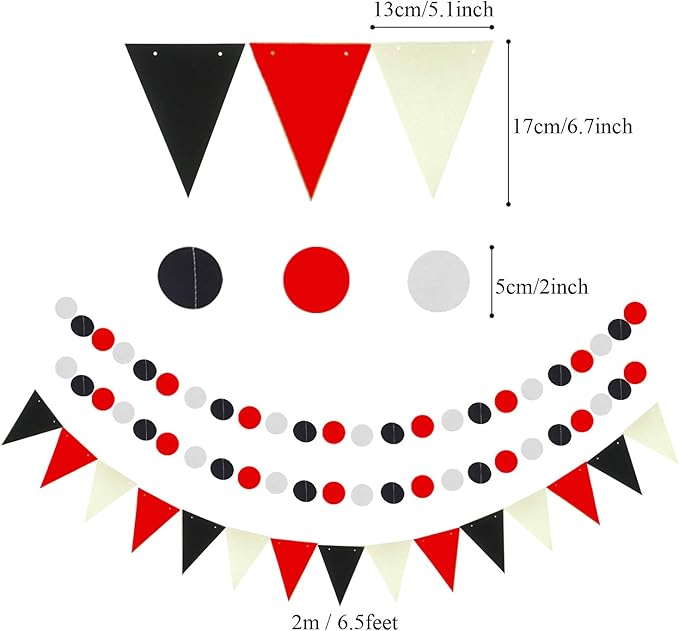 - Includes: 1 x 6.5ft Triangular pennants, 8 x 10inch/25cm Paper pompoms, 6 x 10inch/25cm Paper fans, 4 x Paper hollow fans, 2 x 6.5ft Circle Paper Garland. ( Color: Black, Red and White)