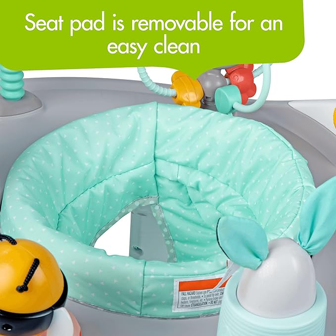 - EASY TO CLEAN: Take care of those unavoidable messes by removing the seat pad from the baby bouncer activity center and tossing it in the washing machine.