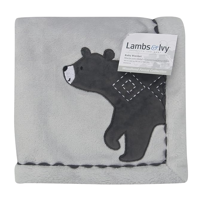 Lambs & Ivy Woodland Forest Gray Fleece Bear Nursery Baby Blanket