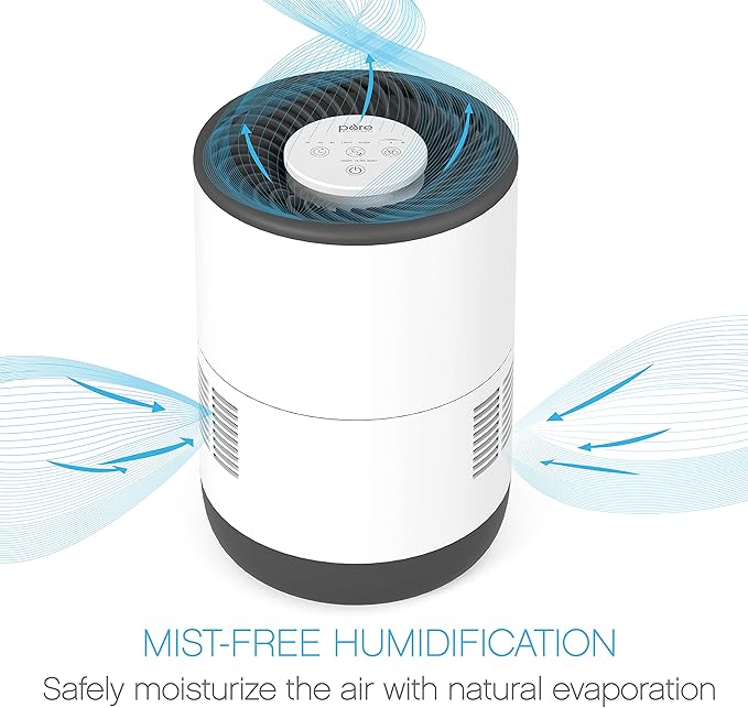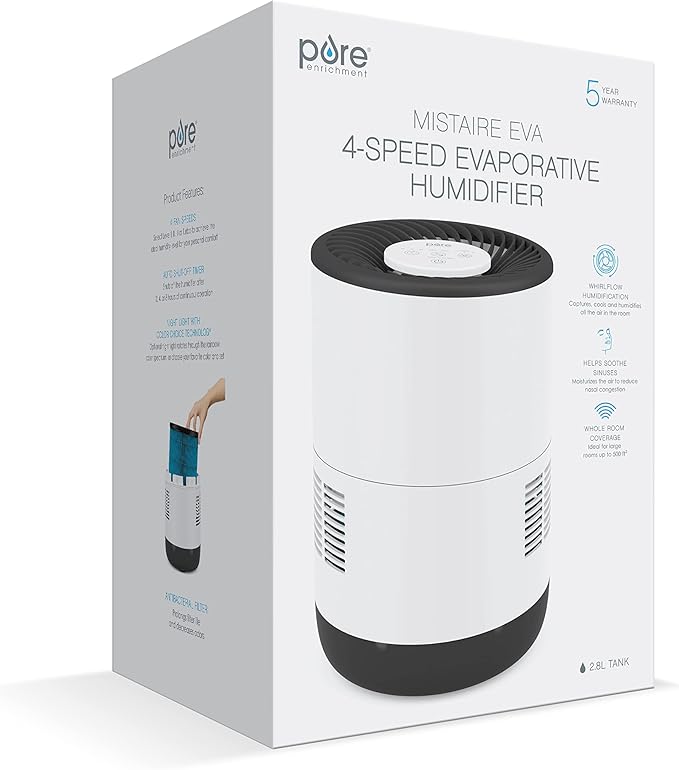 Pure Enrichment MistAire Eva - Mist-Free Evaporative Humidifier (2.8L) with Antibacterial Filter, 4-Speeds, Large Room Coverage up to 500 sq. ft., and Auto Shut-Off Timer