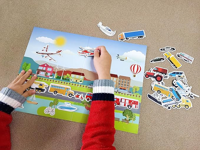- Portable & Elegant: Opened, it provides 2 fun play scenes with highway, suburbs, seashore, airport and multiple objects, with which kids could exercise their imaginations for hours. Closed, it’s a thin pamphlet so kids could easily carry them around on trip, the magnets will stay on the board safely.