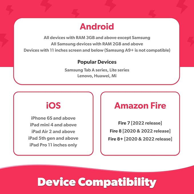 - COMPATIBILITY: This Device is Compatible with iOS - iPhone 6 & above, iPad 5th Gen & above (Note: iPad Mini 1 & iPad Pro 12.9” are not supported) | Android: OS 8 & above, 2GB RAM & above, (Note: For smartphones, it is mandatory to have a front camera at the top centre; 10"" screen tablets & above are not supported) | Amazon Fire: 7 - 2022, 8 - 2018 & 2020, 8+ - 2020. Check the compatibility dashboard on the official PlayShifu website for the full list of compatible devices