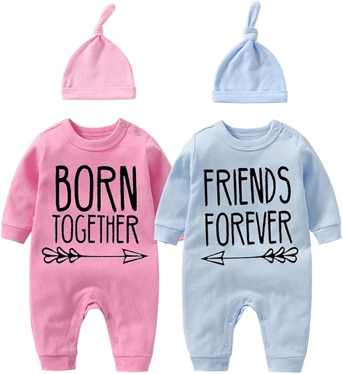YSCULBUTOL Baby Twins Bodysuit Born Together Friends Forever Newborn Clothes Unisex Twin Outfits With Hat