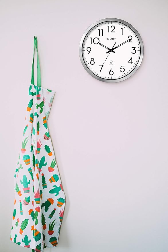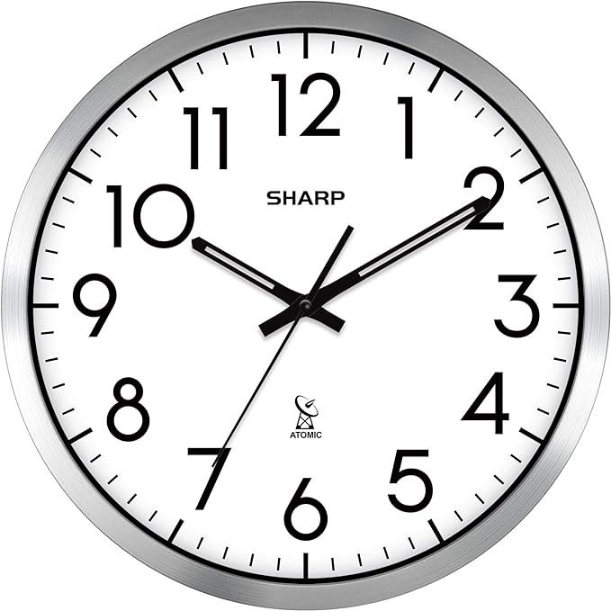 Sharp Atomic Analog Wall Clock - 12" Silver Brushed Finish - Sets Automatically- Battery Operated - Easy to Read - Easy to Use– Modern Design and Style
