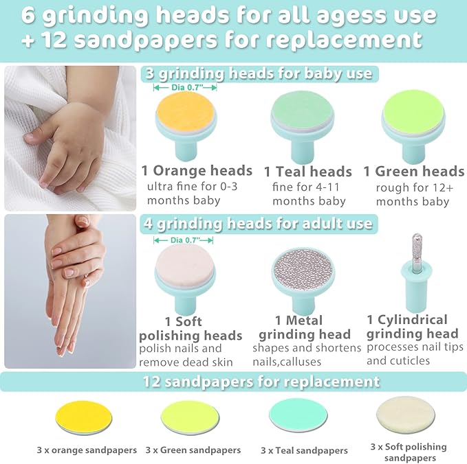 - NAIL CARE KIT FOR BABIES AND ADULTS - Better than others, this baby nail file set includes 1 nail clipper, 6 grinding heads and 12 extra sandpapers. Colored sandpapers with 3 textures are designed for different stages of babies' growth. Electric baby nail trimmer also comes with 1 cylindrical grinding head and 1 metal grinding head for adults, 1 soft grinding heads for polishing. The nail clippers can be used for newborn, infant, toddlers, kids from 0 to 12 months or above, as well as adults