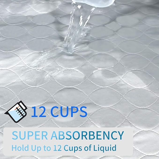 - SUPER ABSORBENT & AIR PERMEABILITY - This bed pad can hold up to 12 cups of liquid. Water can be absorbed quickly into the pad and dispersed. With air permeable materials, this pad gives you added comfort